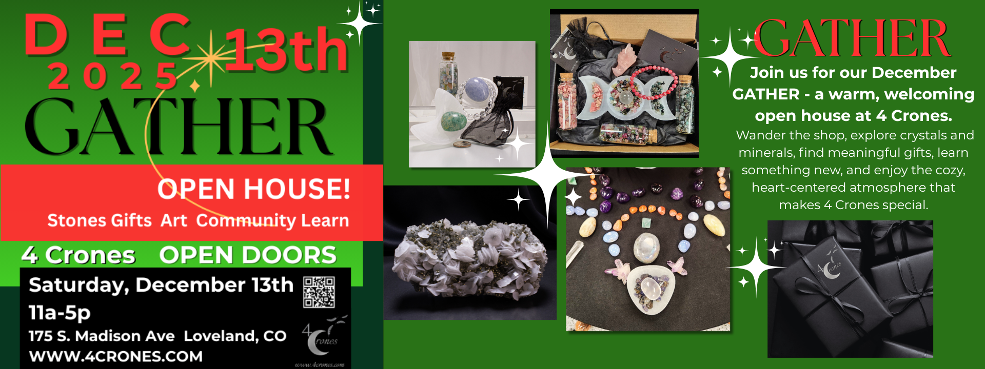 Join us each month at 4 Crones for our Gather / Open House — a welcoming space to connect with community, explore new stones and minerals, and share in soulful experiences. You’re invited to browse the shop, experience the energy of our curated stone collections, and enjoy conversations with others who are drawn to the magic of minerals and community. Each month brings a new theme, fresh arrivals, and a chance to simply be present in a warm, creative, and healing environment.