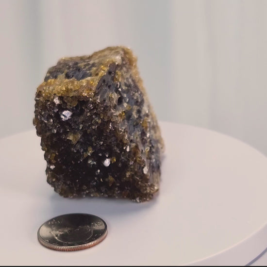 Amber Calcite, or Honey Calcite, is a calcium carbonate mineral (CaCO₃) with a warm amber to golden hue, often forming translucent clusters with reflective surfaces. It crystallizes in the trigonal system and has a Mohs hardness of 3, making it both delicate and visually striking. The amber color results from trace impurities like iron.